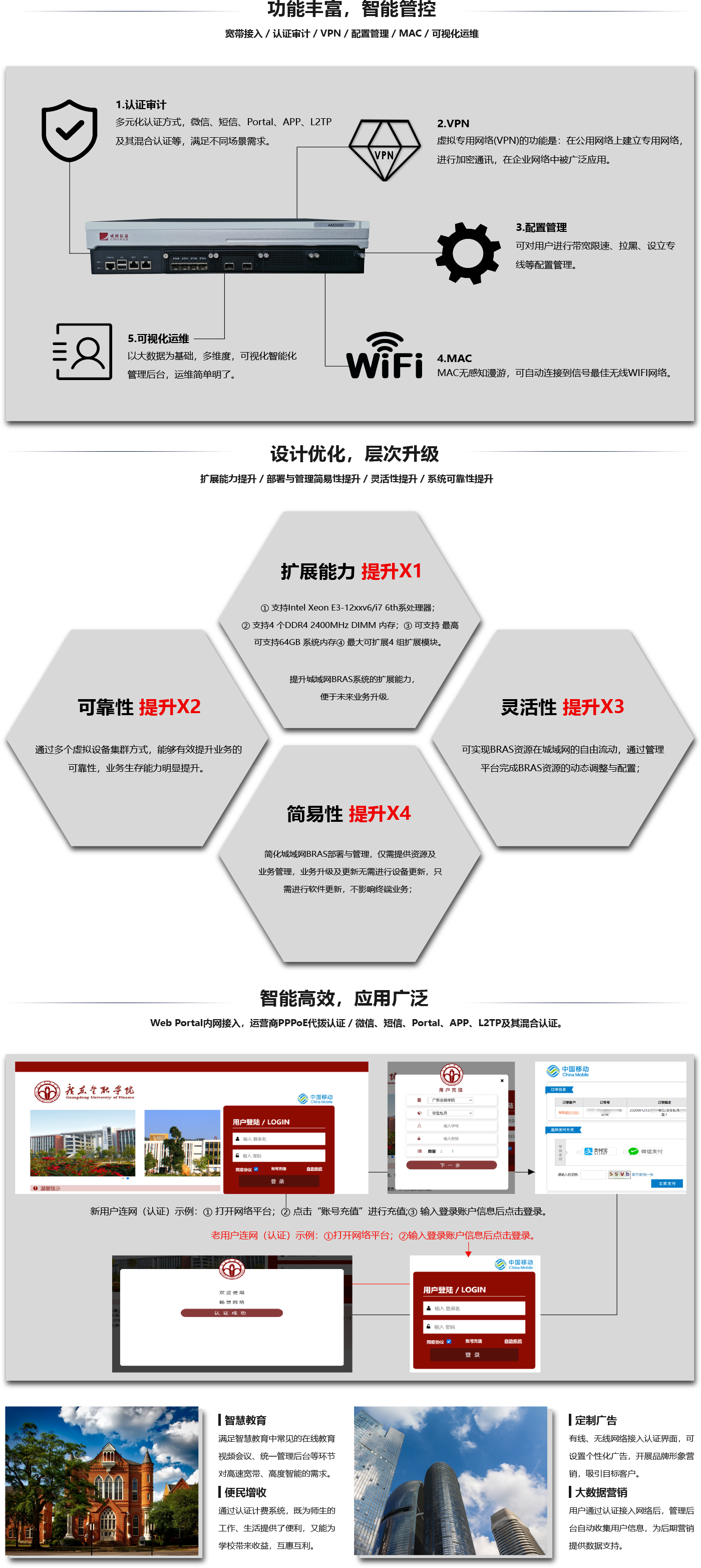 寬帶接入服務器(qì)(英文(wén):Broadbaφ nd Remote Access Server,簡稱BRAS),是(sh<₹®♣ì)面向寬帶網絡應用(yòng)的(de)新型接'" 入網關,它位于骨幹網的(de)邊緣層,可(kě)以><完成用(yòng)戶帶寬的(de)IP/ATM網的(de)數(shù)據接入(目∞←•前接入手段主要(yào)基于xDSL/Cable Modem/σ←高(gāo)速以太網技(jì)術(shù±₩)(LAN)/無線寬帶數(shù)據接入(WLAN)等),實現(☆≠xiàn)商業(yè)樓宇及小(xiǎo)區(qū)住戶的(de)寬β↕λ™帶上(shàng)網、基于IPSec(IP Secu¶¥ ↓rity Protocol)的(de)IP VPN服務、構建企業(yè)內(nèi)部Intranγ&↓↕et、支持ISP向用(yòng)戶批發業(yè)務等應用(yòng)。