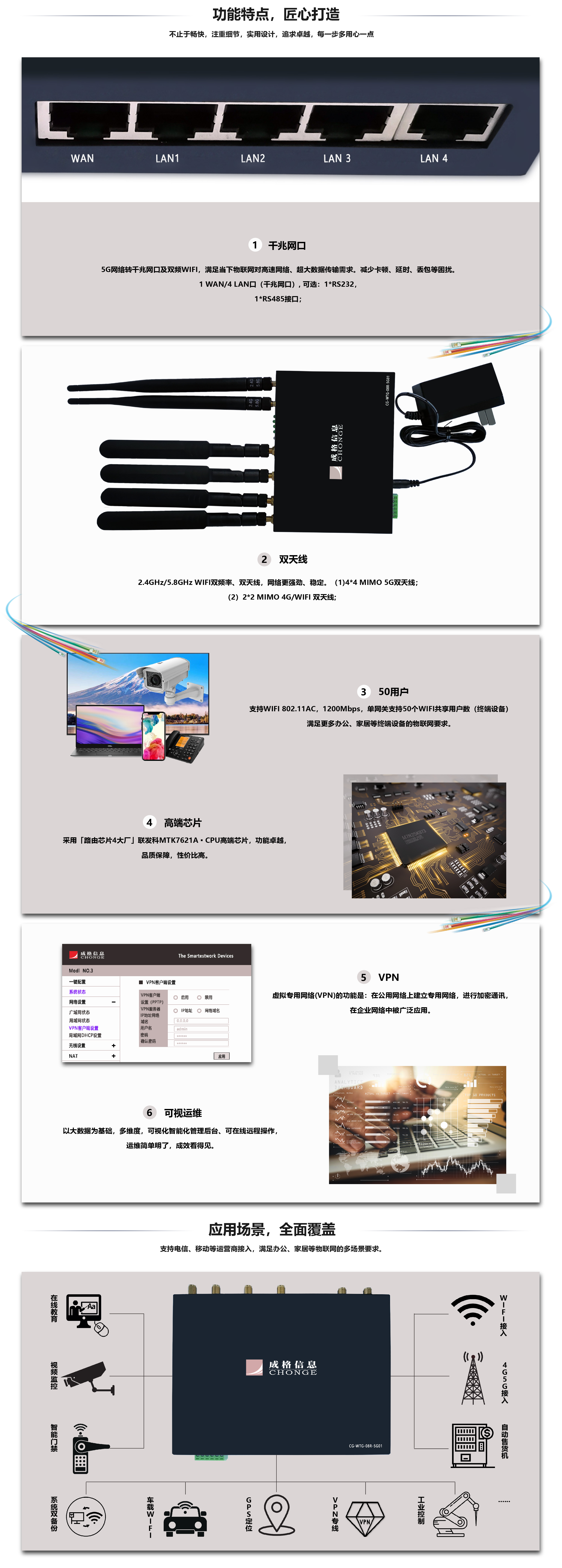 CG-WTG-08R-5G01工(gōng)業(yè)路(lù)由器(qσ"✔ ì)/網關,是(shì)基于5G蜂窩技(jì)術(shù)和(hé)∑✔Wi-Fi網絡技(jì)術(shù)開(kāi)發的≥ε™(de)無線高(gāo)速工(gōng)業(yè)路(lù)由解決方案。支持工(gōng)業(yè)設備數(shù)據采集、髒數(shù)據清洗,協 ↓←議(yì)解析、邊緣計(jì)算(suàn),多(duō)平台數(shù)據傳輸₩↓₩,支持VPN及數(shù)據加密傳輸。即插即用(yòng)的(de)數(shù)幹兆比特連接方案替代DSL、有•‍β(yǒu)線和(hé)光(guāng)纖部署,實現(xiàn)傳統工(gōng)業Ω£™(yè)設備互聯互通(tōng)行(xíng)©™γ業(yè)的(de)變革,為(wèi)智能(néng)制(zhì)造提供可(kě)靠技(♣÷εjì)術(shù)解決方案。